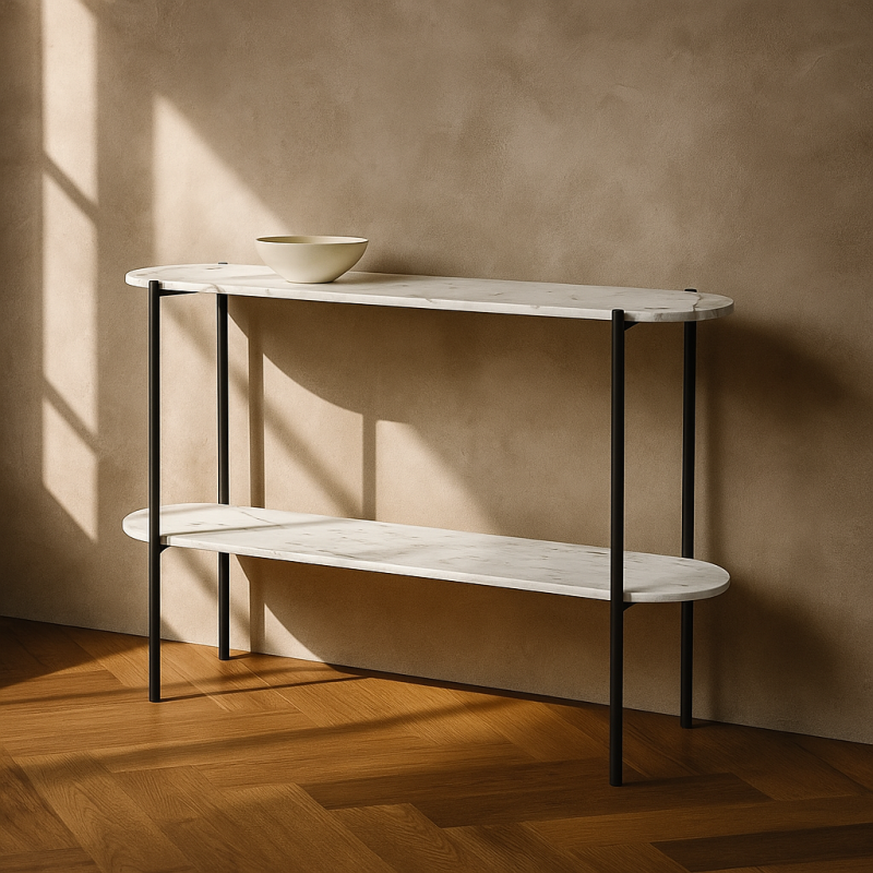 Konsola Loen to bardzo stylowy i użytkowy mebel. Dwie półki z pięknego, polerowanego marmuru tworzą przestrzeń do zaaranżowania wyjątkowej dekoracji - pomieszczą sporo przedmiotów takich jak książki, zdjęcia, wazony, świeczki.