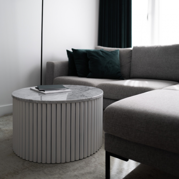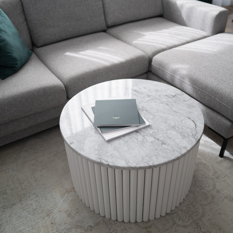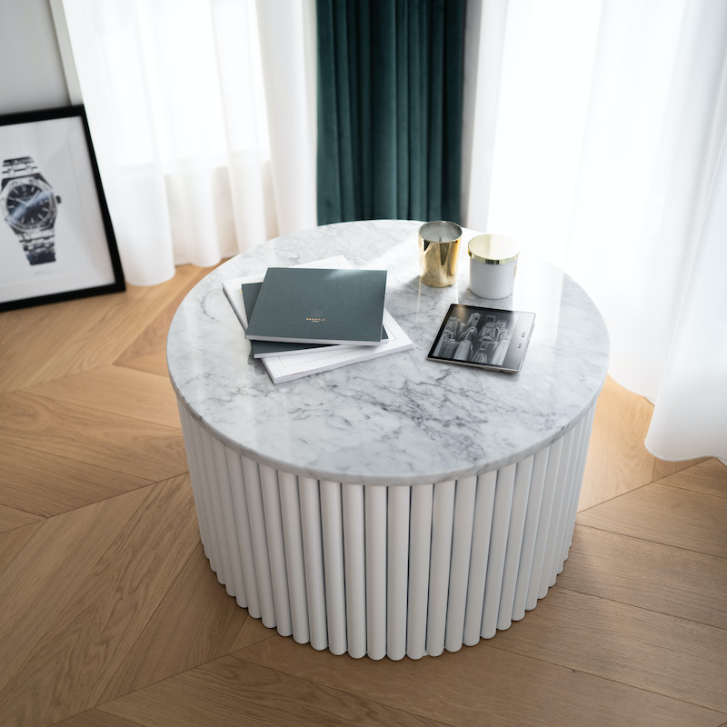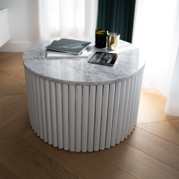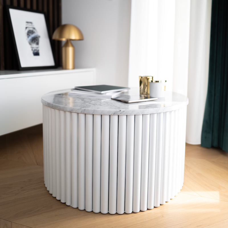 Stolik kawowy Ole przyciąga uwagę swoją ryflowaną podstawą idealnie dopasowaną do marmurowego blatu Bianco Carrara.